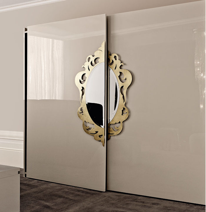 Шкаф имеет систему бесшумного открывания дверей. В центре шкафа располагается зеркало в резной раме, отделанной золотой краской ручным способом. Внутри установлена компланарная система и секции с выдвижными ящиками.