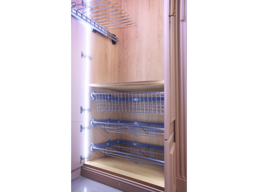 Рады представить Вам серию шкафов "Леонрадо" в бежевом цвете. В эту серию входит шкаф для одежды с пантографом и ящиками для одежды, вместительные выдвижные колонки для обуви, шкаф с интегрированной кроватью, гладильной доской, секциями под белье и одежду. Эта композиция имеет отличный потенциал для большой семьи.